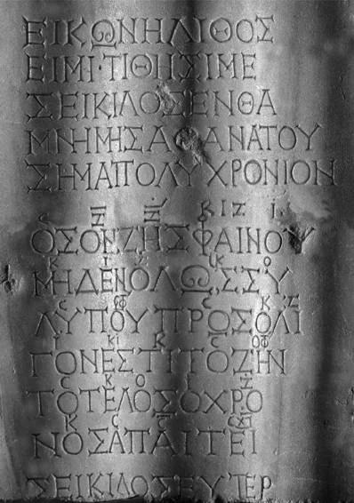 The Seikilos Stele, which contains a dedication and a song known as the Seikilos Epitaph
